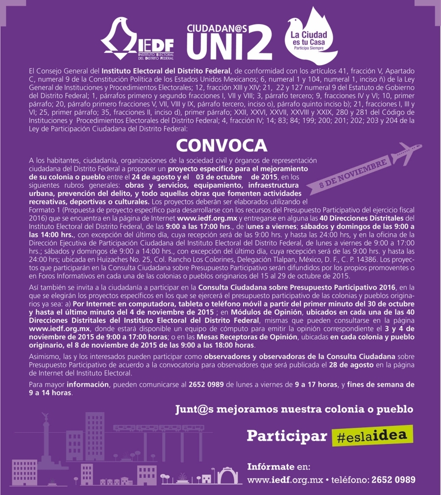 - Versión completa del acuerdo del Consejo General del Instituto Electoral del Distrito Federal por el que se aprueba la Convocatoria dirigida a la ciudadanía del Distrito Federal, para participar en la Consulta Ciudadana sobre Presupuesto Participativo 2016, que se realizará en noviembre de 2015, en las colonias y pueblos originarios en que se divide el territorio del Distrito Federal.